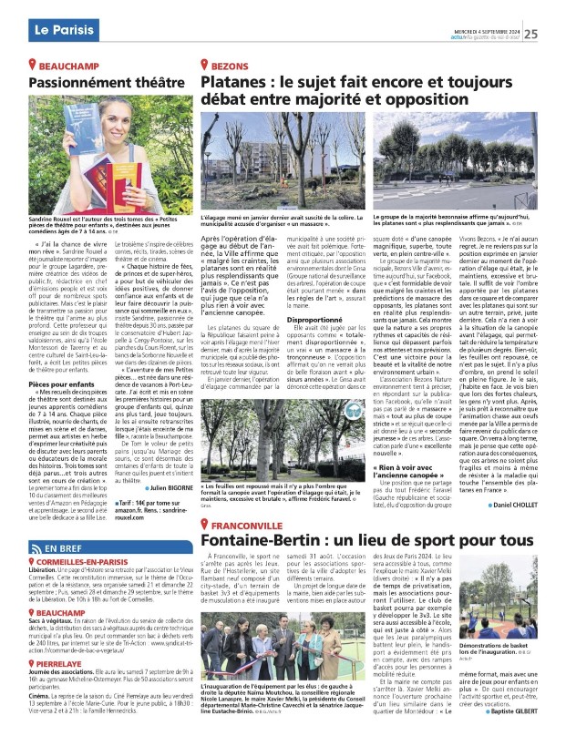 « Chaque histoire de fées, de princes et de super-héros, a pour but de véhiculer des idées positives, de donner confiance aux enfants et de leur faire découvrir la puissance qui sommeille en eux », insiste Sandrine, passionnée de théâtre depuis 30 ans, passée par le conservatoire d’Hubert Jappelle à Cergy-Pontoise, sur les planches du Cours Florent, sur les bancs de la Sorbonne Nouvelle et vue dans des dizaines de pièces. « L’aventure de mes Petites pièces… est née dans une résidence de vacances à Port-Leucate. J’ai écrit et mis en scène les premières histoires pour un groupe d’enfants qui, quinze ans plus tard, joue toujours. Je les ai ensuite retranscrites lorsque j’étais enceinte de ma fille », raconte la Beauchampoise. De Tom le voleur de petits pains jusqu’au Mariage des souris, ce sont désormais des centaines d’enfants de toute la France qui les jouent et s’initient au théâtre. Julien BIGORNE